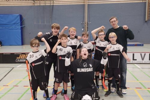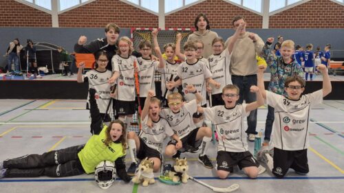 „Rudel-Power“ – während die Eltern den Heimspieltag in der Ballsporthalle vorbereiteten, lernte das U11-Team weiß – erstmalig in den neuen weißen Trikots – die neuen Wölfe-Maskottchen „Black Lupa“ und „Little Albo“ kennen, die dann natürlich beim ersten Spiel gegen die Hannover Mustangs direkt mit auf der Bank saßen und einen rasanten Start erlebten. Denn auf das 1:0 von Finn L. nach 11 Sekunden folgte der Ausgleich nur 33 Sekunden später. In der gesamten ersten Hälfte zeigten die Wölfe weiß Zug nach vorne, gute Übersicht und tolle Spielzüge. Das Trainerteam hatte die Blöcke ausgeglichen und aufeinander abgestimmt zusammengestellt. Je zwei Tore von Erik und Peo brachten die verdiente 5:2-Pausenführung. In den ersten fünf Minuten der zweiten Hälfte fielen jeweils zwei Tore für beide Mannschaften. Nach ein paar ungenutzten Chancen der Wölfe weiß kamen die Mustangs besser ins Spiel und drängten auf die Anschlusstreffer. Doch alle drei Lilienthaler Blöcke und Törhüterin Elli brachten noch einmal vollen Einsatz, so dass selbst das Powerplay der Mustangs am Schluss – teilweise mit vier Feldspieler:innen ohne Goalie – mit zwei Toren von Thies und Peo beantwortet werden konnte zum 9:5-Endstand.
